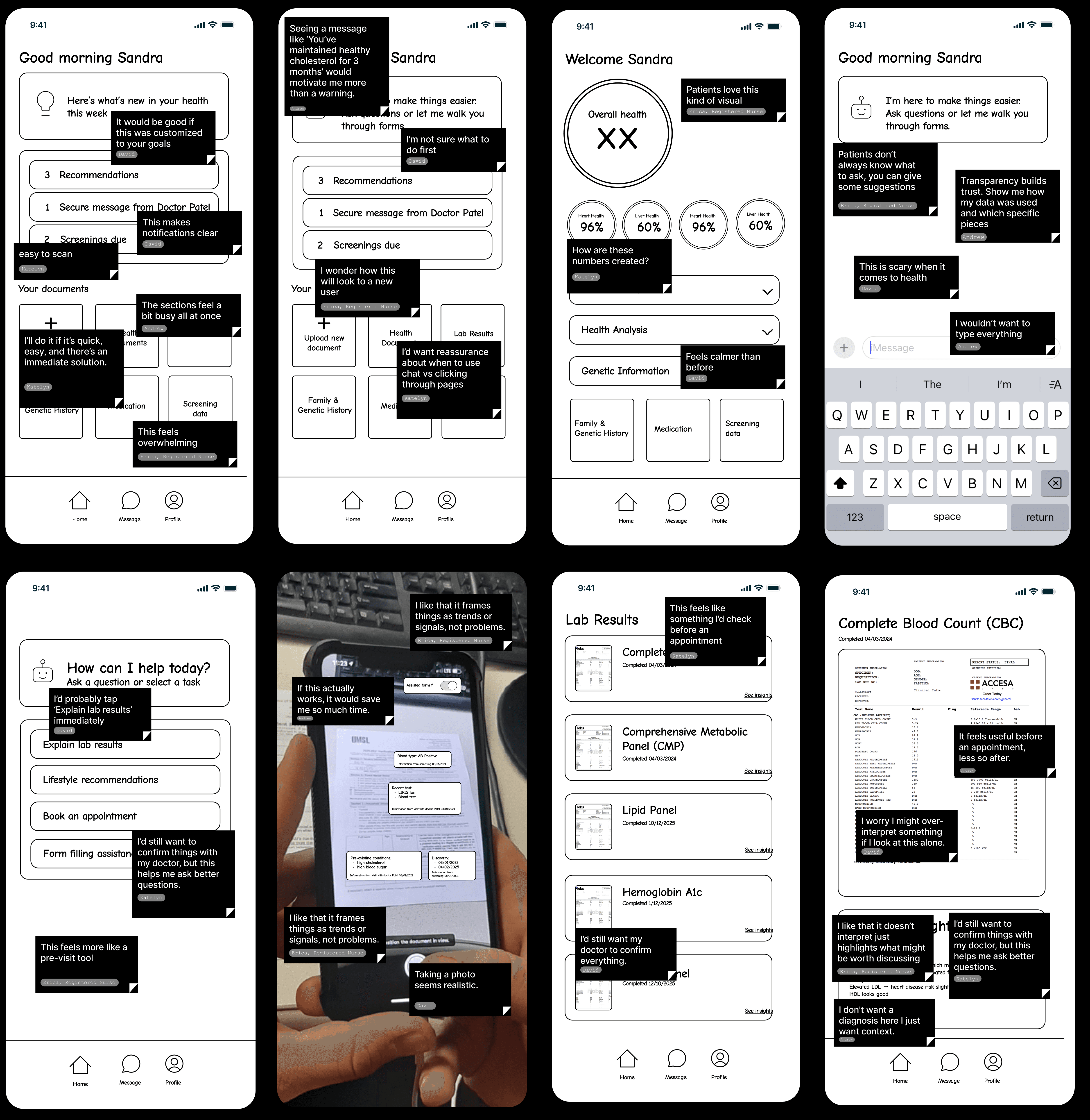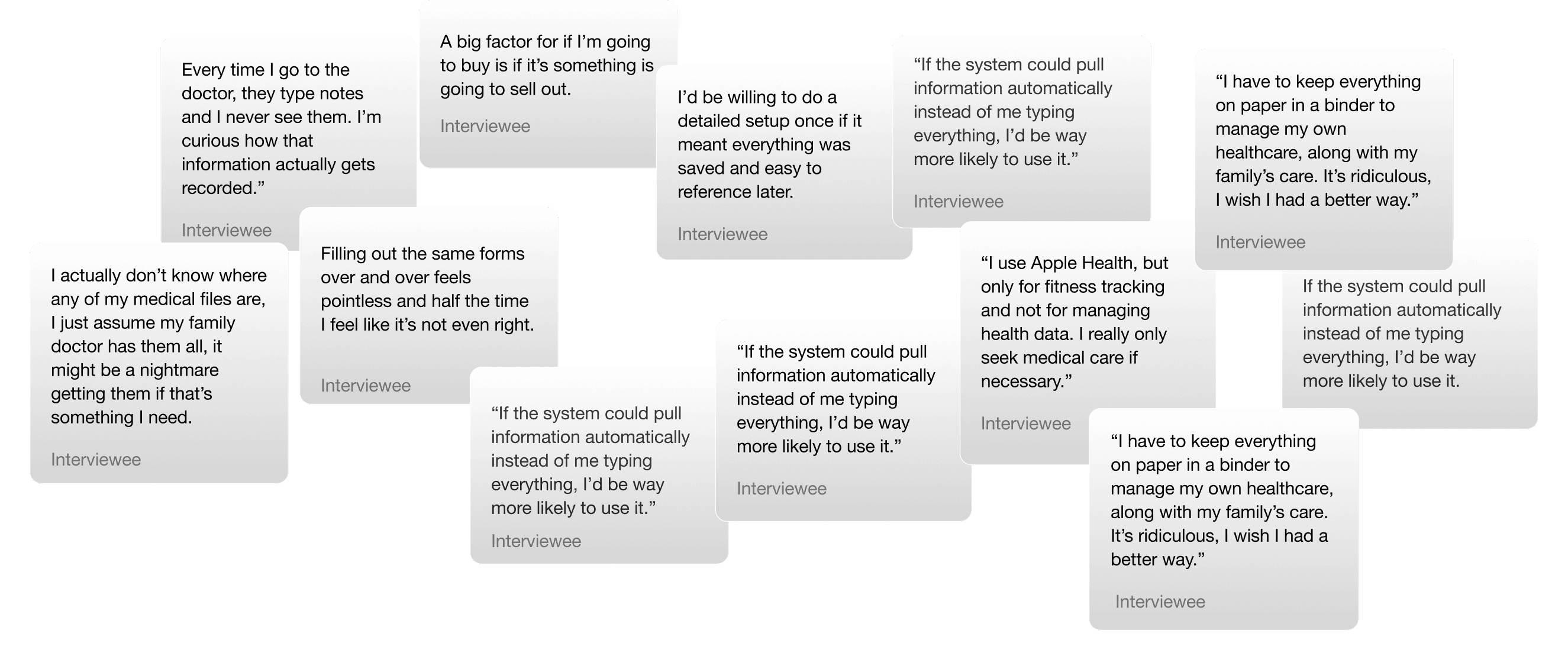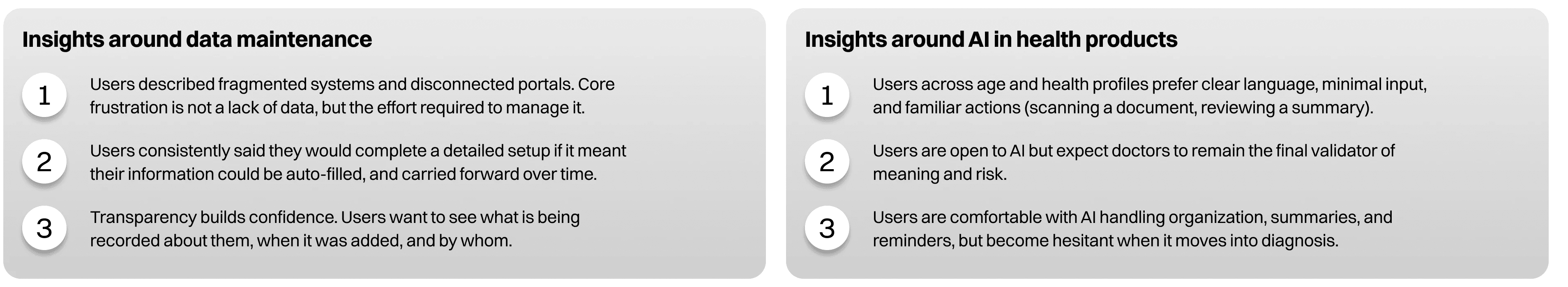 Through interviews with everyday patients, individuals managing chronic conditions, and healthcare professionals including doctors and nurses, consistent patterns emerged around how health information is accessed and used. Our research circulated the themes of data inputs and AI in healthcare. Patients described relying on multiple portals, emails, and personal notes to keep track of their care, while clinicians noted limited visibility into data generated outside their own systems. Across all groups, the lack of a shared, centralized view of health information made it harder to track history, identify patterns, and have informed conversations during care visits.