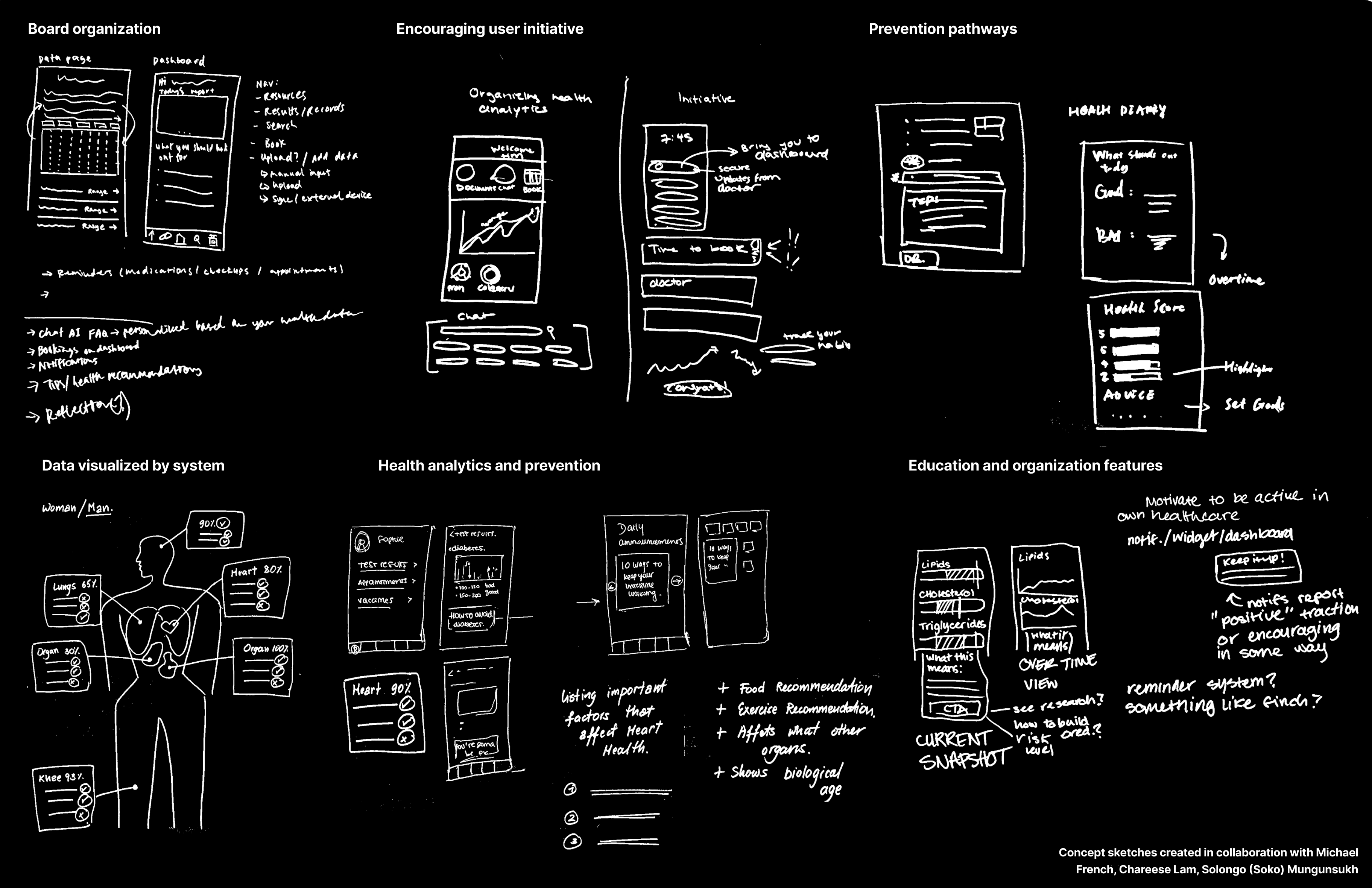 Low-fidelity sketches were used to define key flows such as onboarding, data connection, and record review. This helped identify navigation needs and content hierarchy before moving into higher-fidelity designs.