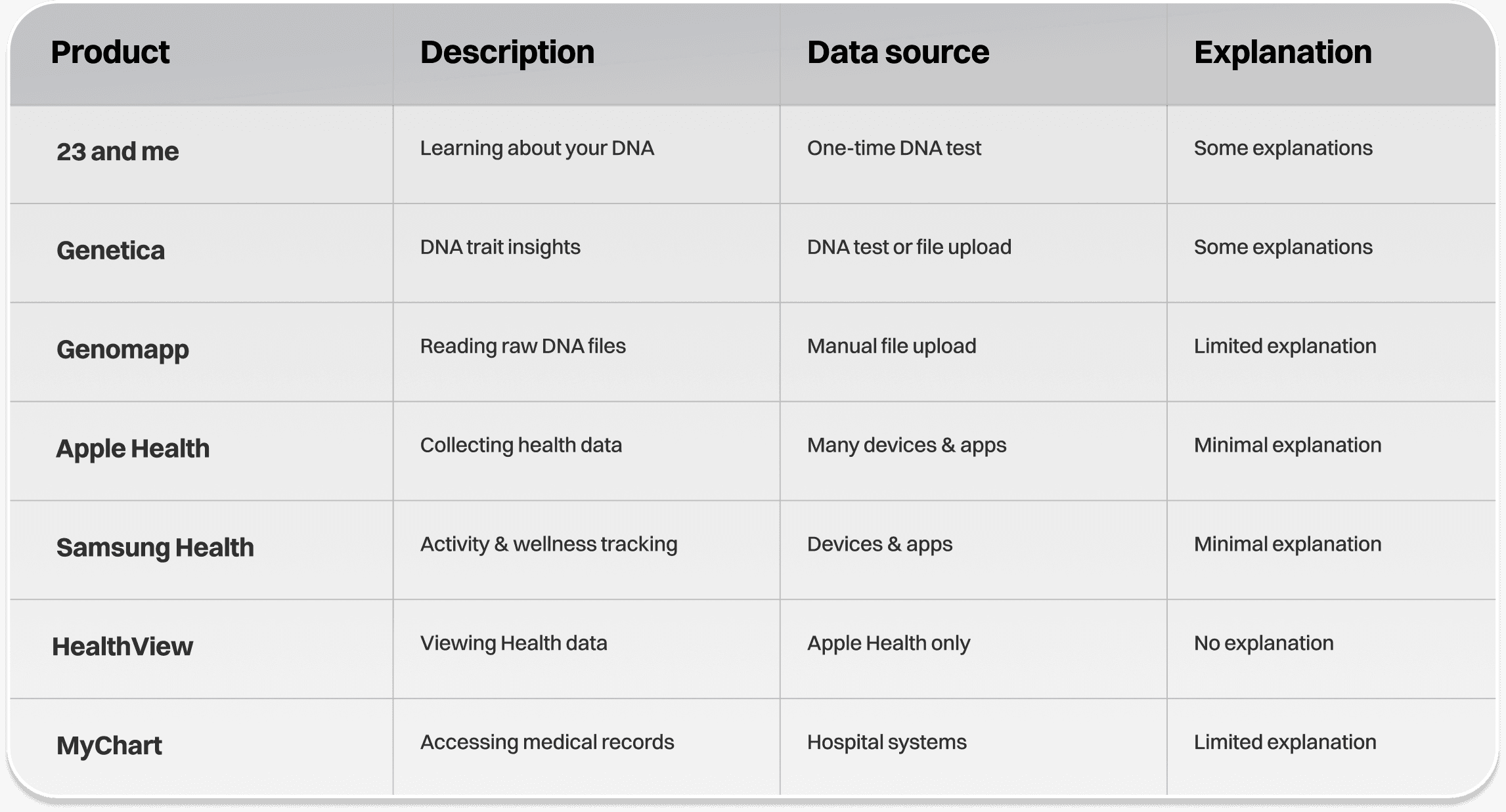 Users manage their health using multiple disconnected systems that do not communicate with each other. As a result, important information is hard to find, difficult to understand, and easy to forget. This makes it challenging for individuals to track changes over time or prepare for conversations with healthcare providers.
