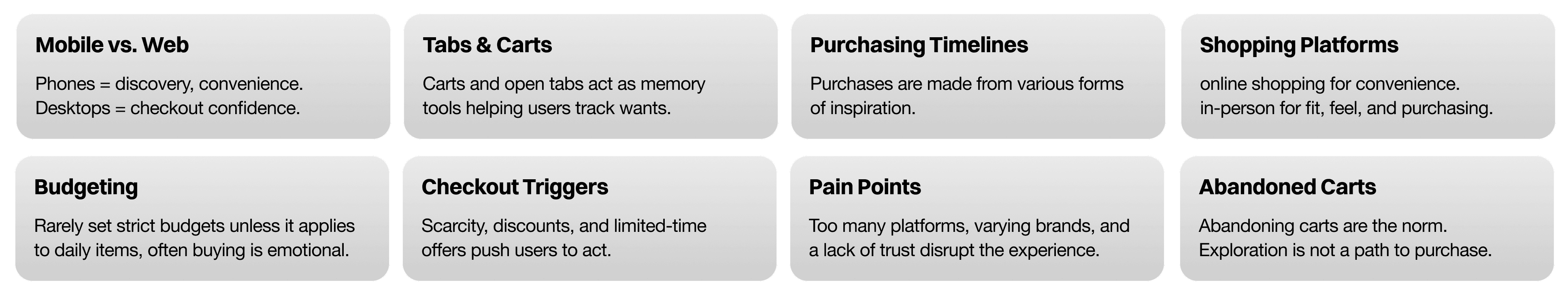 Users often use carts as a way to research and remember items, not as a commitment to buy. Higher priced items tend to stay in consideration longer. Many users care more about understanding their taste than receiving recommendations. Over time, algorithms can make discovery feel repetitive and impersonal.