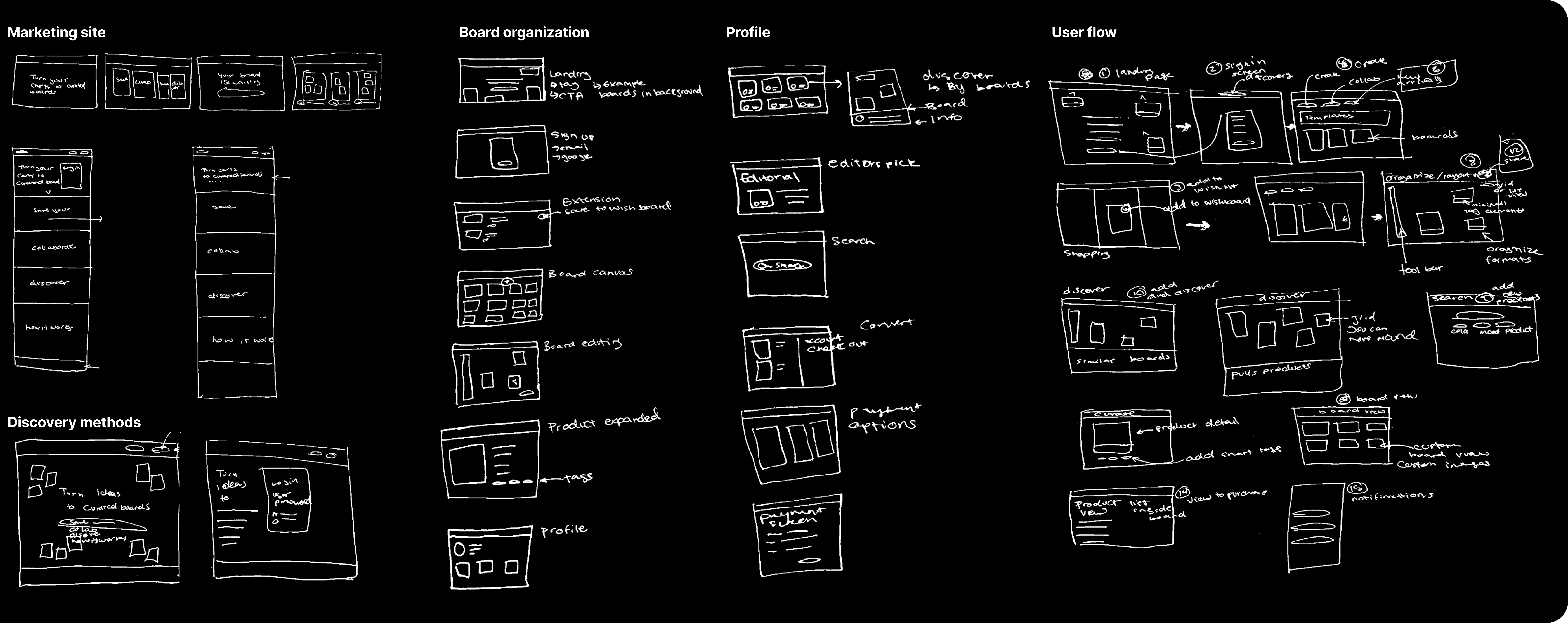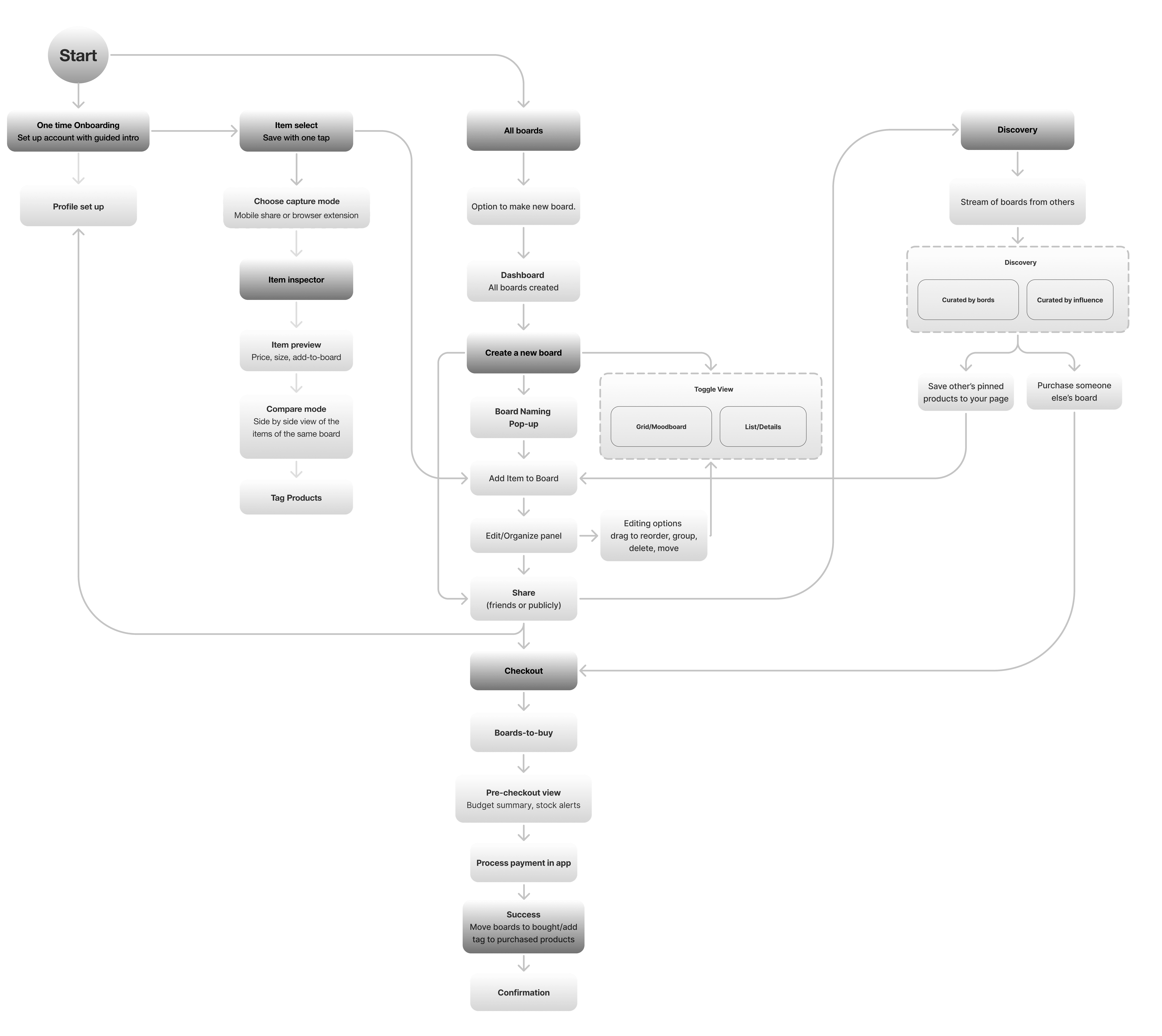 The architecture prioritizes persistence over transactional speed. Rather than optimizing for isolated purchases, the system is designed to preserve evolving user intent across time. Inspiration, organization, and checkout exist within a continuous framework that supports long, non-linear decision-making and durable tracking across boards.